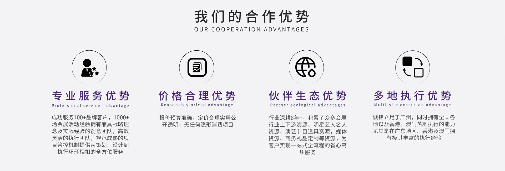 誠(chéng)銘文化成立於2014年,是一家 為 企 業(yè) 和 組 織 機(jī) 構(gòu) 提 供 專 業(yè) 的 會(huì) 務(wù) 、展覽、展示和傳播全流程服務(wù)於一體的綜合型公關(guān)活動(dòng)公司。誠(chéng)銘憑借敏銳的洞察力、富於高度的戰(zhàn)略思考力、精準(zhǔn)的創(chuàng)意策劃力超強(qiáng)的執(zhí)行力,為客戶提供具有競(jìng)爭(zhēng)力、高品質(zhì)、高性價(jià)比的活動(dòng)策劃及落地執(zhí)行服務(wù)。誠(chéng)銘文化以誠(chéng)信運(yùn)營(yíng)為基礎(chǔ)、以客戶滿意為目標(biāo)、以完善執(zhí)行謀發(fā)展,不斷求索、創(chuàng)新、超越、務(wù)求成為深受客戶信賴和讚許的戰(zhàn)略合作夥伴,致力於成為一家在不斷變化的市場(chǎng)中為企業(yè)建設(shè)優(yōu)勢(shì)品牌提供有力支持的一站式全流程品牌服務(wù)商。